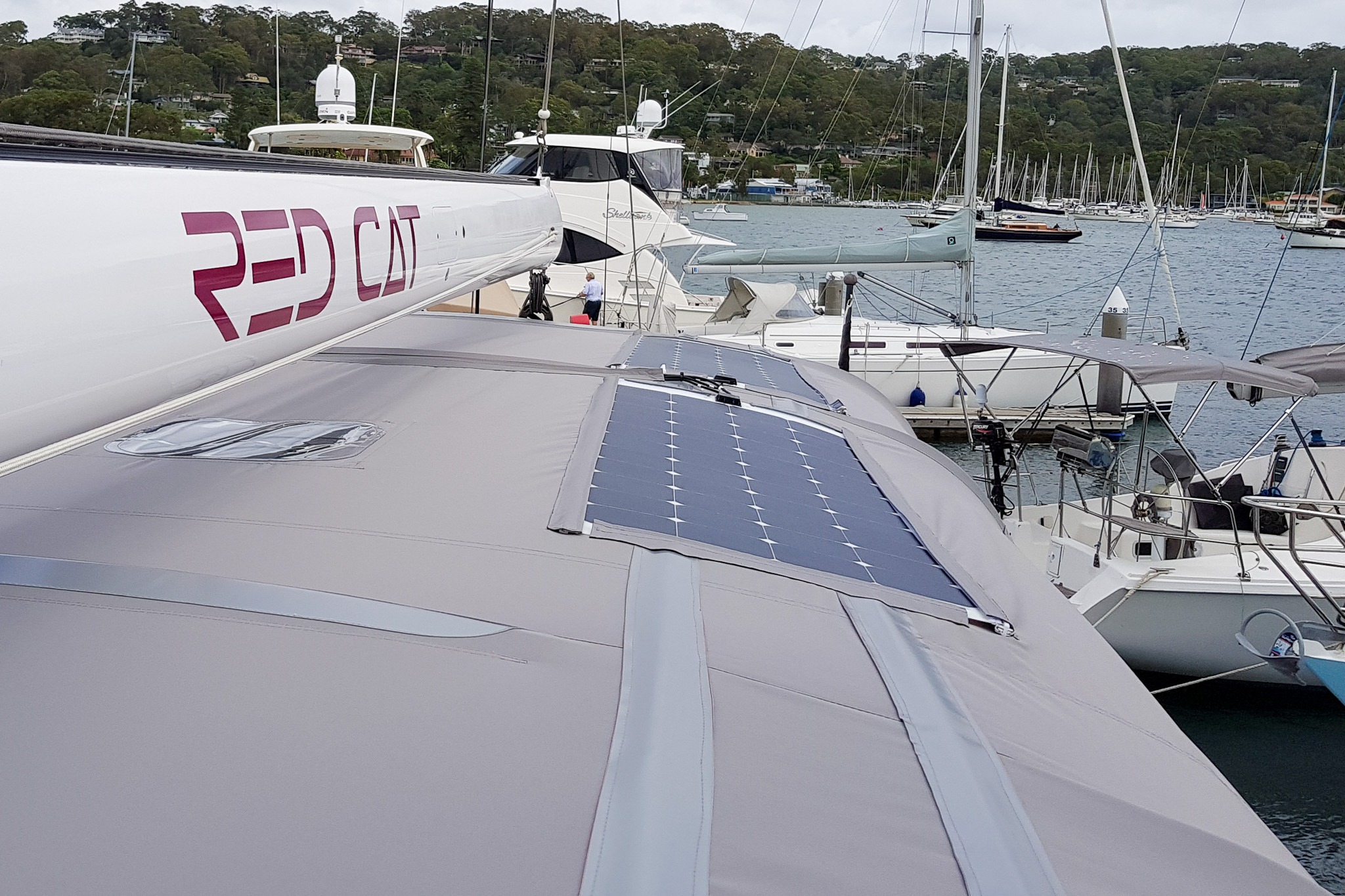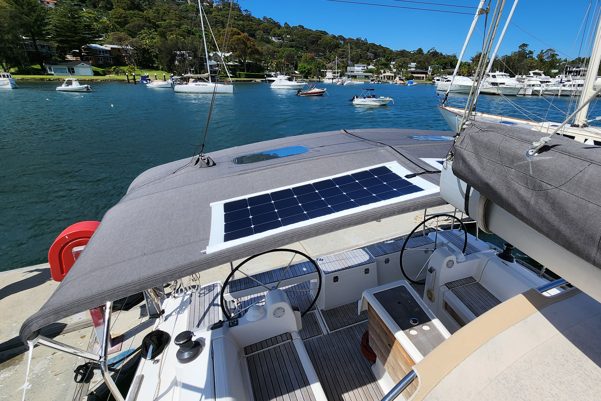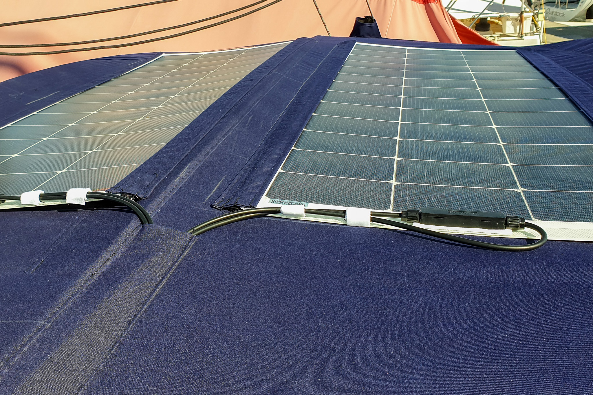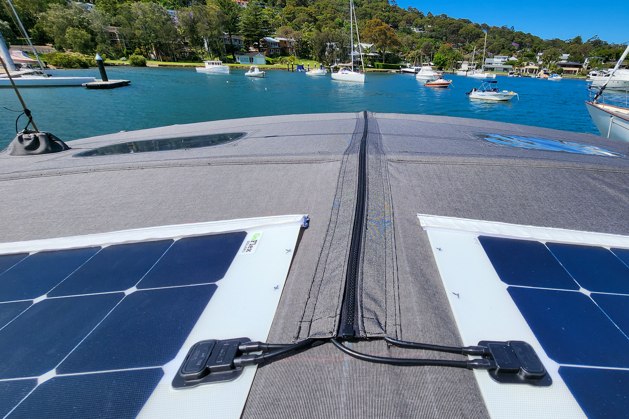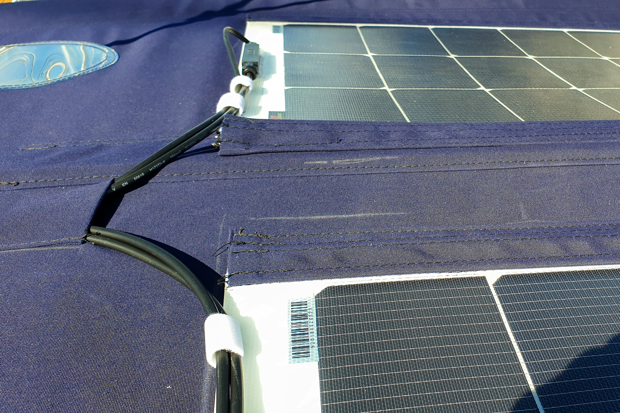 Flexible solar panels are securely zipped to the Bimini with reinforced seams and UV flaps for protection. A built-in top pocket houses and supports cabling, keeping it tidy and protected from the elements. This setup allows the entire Bimini and solar panels to be removed quickly —ideal when reducing windage is a priority.