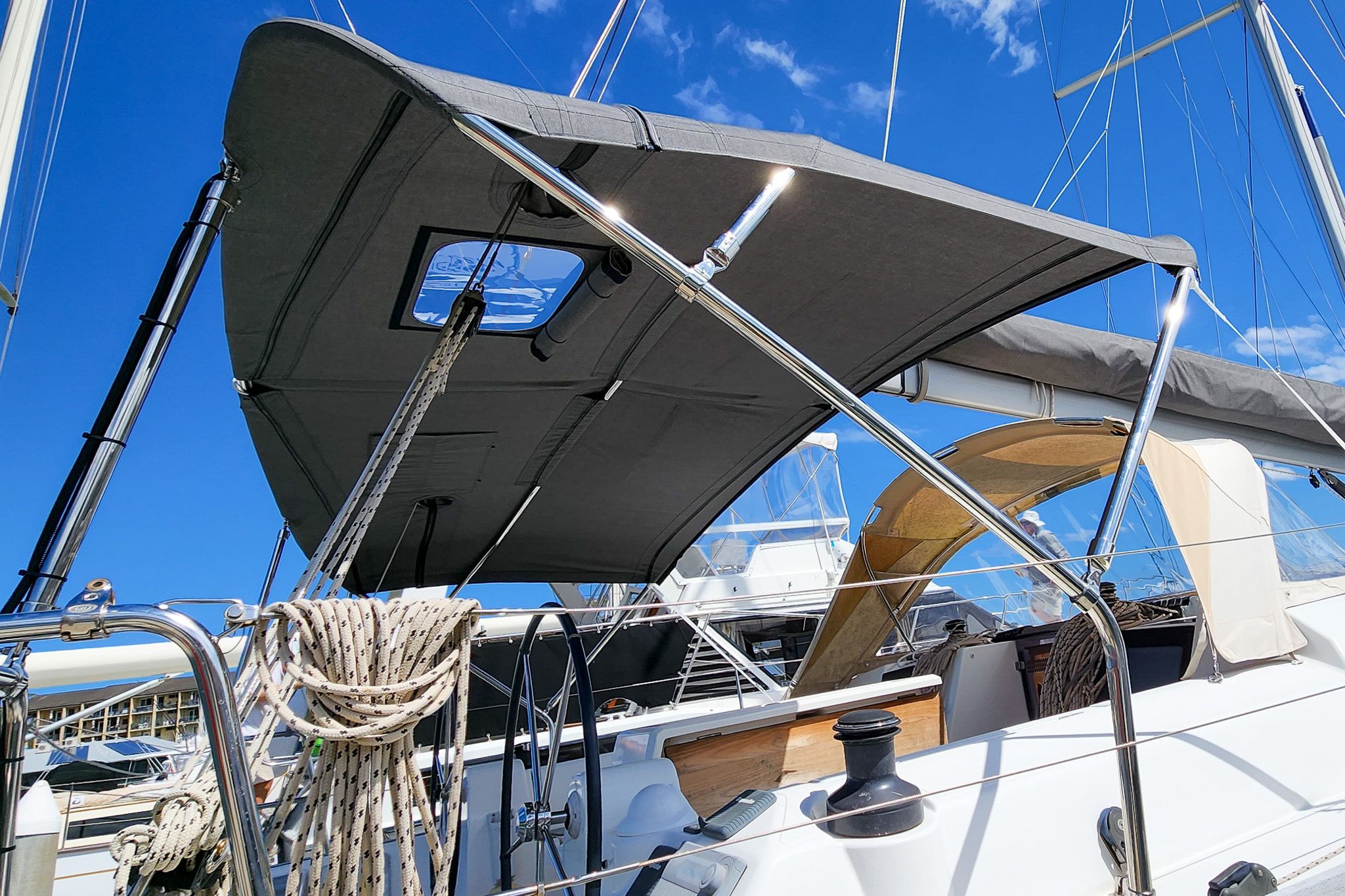 We design and build custom Biminis using 100% solution dyed Yacht Acrylic canvas, tailored to your helm station and built for offshore conditions. Features include a zippered window for mainsail trimming, reinforced backstay cutouts, and zipped pockets for easy removal.