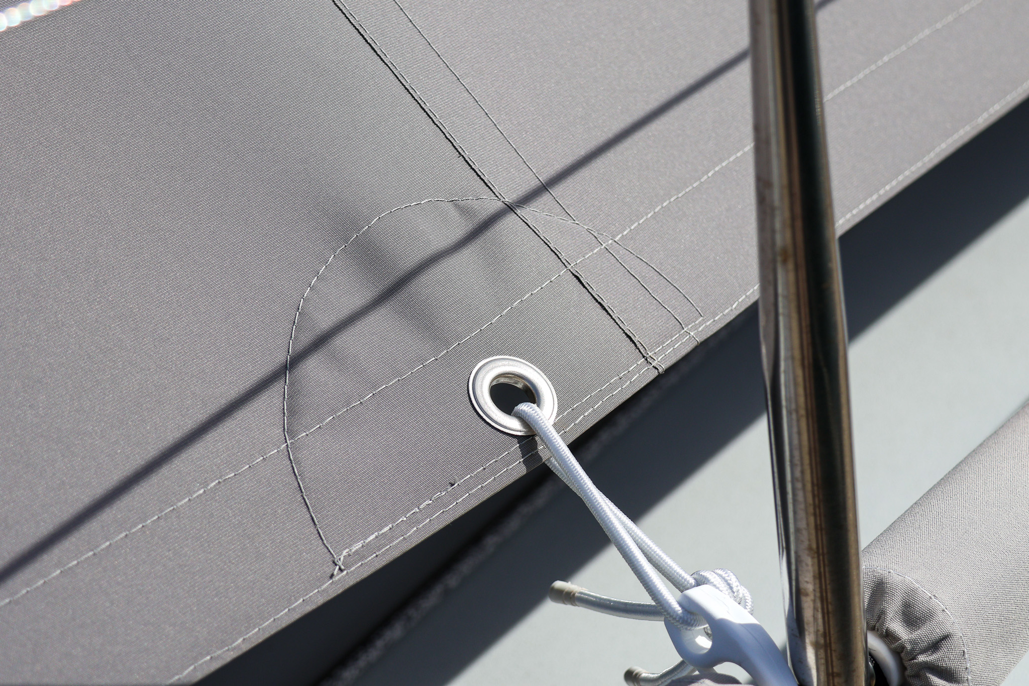 The Boom Bag is manufactured using 100% solution dyed Yacht Acrylic canvas with marine-grade PVC wear patches at high-contact areas. It features heavy marine-grade plastic zips and 316 stainless steel fittings. Inside, 16mm solid fiberglass battens provide rigidity and distribute loads evenly. Lazy jack attachment points transfer stress directly to the battens, protecting the bag fabric. The bag is slightly oversized for easy sail drop and improved airflow to prevent mould.